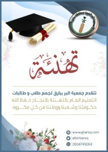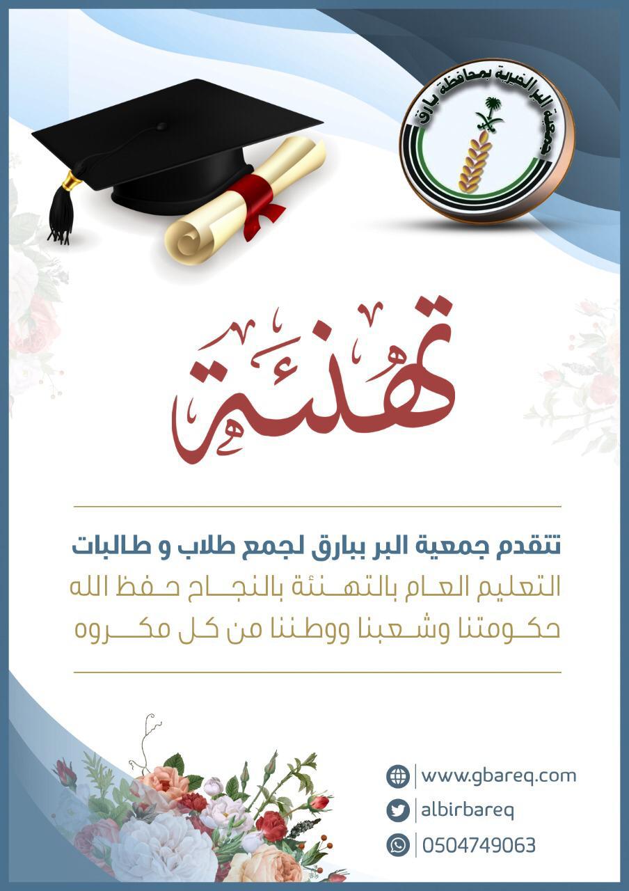 تتقدم جمعية البر الخيرية بمحافظة بارق بكافة منسوبيها بزف أجمل التهاني والتبريكات إلى أبنائنا وبناتنا طلاب التعليم العام بمناسبة نجاحهم لعام ١٤٤١ هـ ونسأل الله العلي القدير أن يحفظ حكومتنا وشعبنا ووطننا من كل مكروه وأن يزيل عنا هذه الغمة عاجلاً غير آجل