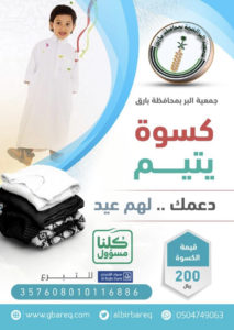 من باب مشاركتهم في المناسبات الاجتماعية والأفراح والأعياد بادرة جمعية الير الخيرية بمحافظة بارق بمعايدة الأيتام المسجلين بالجمعية وإيداع مبالغ كسوة العيد على حساباتهم البنكية وقد أستفاد من ذلك عدد ( 168 يتيماً ويتيمة ) ..