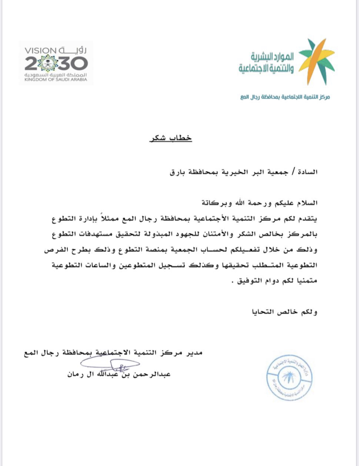 تلقت إدارة جمعية البر الخيرية بمحافظة بارق خطاب شكر وتقدير من مركز التنمية الاجتماعية بمحافظة رجال ألمع وذلك نذير المجهودات والفرص التطوعية المقدمة في حساب الجمعية بمنصة التطوع وتفعيل الحساب بشكل صحيح وطرح فرص تطوعية عديدة وتسجيل المتطوعين