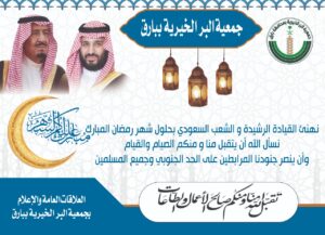قدم منسوبي جمعية البر الخيرية بمحافظة بارق أسمى آيات التهاني و التبريكات إلى مقام خادم الحرمين الشريفين الملك سلمان بن عبدالعزيز و ولي عهده الأمين صاحب السمو الملكي الأمير محمد بن سلمان و إلى أمير منطقة عسير صاحب السمو الملكي الأمير تركي بن طلال بن عبدالعزيز و إلى الأسرة المالكة والشعب السعودي بمناسبة حلول شهر رمضان المبارك .